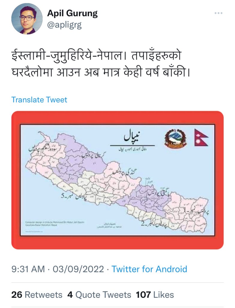 अपिल गुरुङ नाम गरेका ट्वीटर प्रयाेगकर्ताले आफ्नाे ह्यान्डल @apligrg गत भदाै १८ गते नेपालकाे नक्सा सेयर गरे । नक्साकाे क्याप्सनमा यस्ताे लेखिएकाे थियाे, “इस्लामी-जुमुहिरिये-नेपाल। तपाईंहरूको घरदैलोमा आउन अब मात्र केही वर्ष बाँकी।” पहिलाे तीन शब्दलाई उर्दु भाषाबाट नेपालीमा उल्था गर्दा “नेपाल गणतन्त्र इस्लाम” भन्ने अर्थ लाग्छ । पाेस्टमा रहेकाे दाेस्राे वाक्यमार्फत मुस्लिम समुदायप्रति नकारात्मक धारणा फैलाउन खाेजेकाे देखिन्छ ।