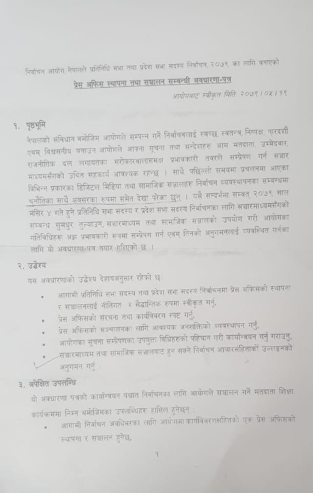 निर्वाचन आयोगले २०७९ भाद्र १९ गते प्रतिनिधिसभा तथा प्रदेशसभा सदस्य निर्वाचन २०७९ का लागि प्रेस अफिस स्थापना तथा सञ्चालन सम्बन्धी अवधारणापत्र स्वीकृत गरेको थियो । यही अवधारणापत्रका आधारमा असोज १४ गते प्रेस अफिसको स्थापना भएको थियो । आयाेगका अनुसार प्रेस अफिसको मुख्य उद्देश्य मंसिर ४ गते हुन गइरहेको प्रतिनिधिसभा तथा प्रदेशसभा सदस्य निर्वाचनका लागि सञ्चारमाध्यमसँगको सम्बन्ध सुमधुर तुल्याउनु, सञ्चारमाध्यम तथा सामाजिक सञ्जालको उपयोग गरी आयोगका गतिविधिहरू अझ प्रभावकारी रूपमा सम्प्रेषण गर्नु एवं तिनको अनुगमनलाई व्यवस्थित गर्नु हाे । (हेर्नुहोस्, अवधारणापत्र पेज १)