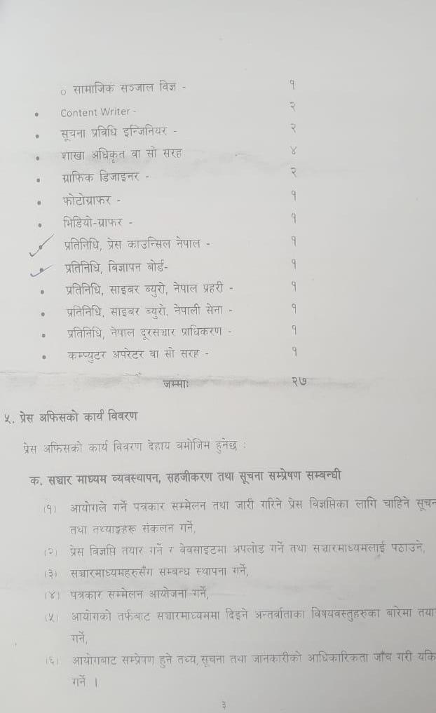 निर्वाचन आयोगले स्वीकृत गरेको अवधारणापत्रमा प्रेस अफिसको कार्य विवरण स्पष्ट उल्लेख छ । प्रेस अफिसले सञ्चारमाध्यम व्यवस्थापन, सहजीकरण तथा सूचना सम्प्रेषण सम्बन्धी काम गर्ने, सामाजिक सञ्जालमा सम्प्रेषण गरिने सामग्री उत्पादन तथा सम्प्रेषण गर्ने, सामाजिक सञ्जाल तथा डिजिटल मिडिया अनुगमन गर्ने, सञ्चारमाध्यम अनुगमन गर्ने र ईबुलेटिन प्रकाशन गर्ने रहेका छन् । सामाजिक सञ्जाल अनुगमनका क्रममा प्रेस अफिसले डिजिटल मिडियामा भ्रमपूर्ण, अफवाहपूर्ण तथा मिथ्या सूचना, दुष्प्रचार, द्वेषपूर्ण अभिव्यक्ति र सूचना तोडमोड गर्ने व्यक्तिलाई त्यस्तो सामग्री, सूचना सामाजिक सञ्जालबाट तत्काल हटाउन लगाउने, त्यस्ता व्यक्तिलाई कानुन बमोजिम कारबाही गर्न सम्बन्धित निकायलाई लेखी पठाउने, झूटा सूचनाको प्रचार भएको शंका लागेमा वा गुनासो प्राप्त गरेमा सोको जाँचबुझ गरी कारबाहीक लागि सम्बन्धित निकायमा लेखी पठाउन सक्छ । त्यसैगरी उम्मेदवारहरूको सामाजिक सञ्जाल गतिविधि अनुगमन गर्ने, सामाजिक सञ्जालमा सम्प्रेषण हुन सक्ने मिथ्या सूचना, दुष्प्रचार तथा द्वेषपूर्ण अभिव्यक्तिको अनुगमन गर्ने, त्यस्ता अभिव्यक्तिहरू सम्बन्धी गुनासाहरू निरुपण गर्ने र सामाजिक सञ्जालका गतिविधिहरूको प्रवृत्ति विश्लेषण लगायत गर्ने निर्वाचन आयोगले स्वीकृत गरेको प्रतिनिधिसभा तथा प्रदेशसभा सदस्य चुनावका लागि प्रेस अफिस स्थापना तथा सञ्चालन सम्बन्धी अवधारणापत्रमा उल्लेख छ ।