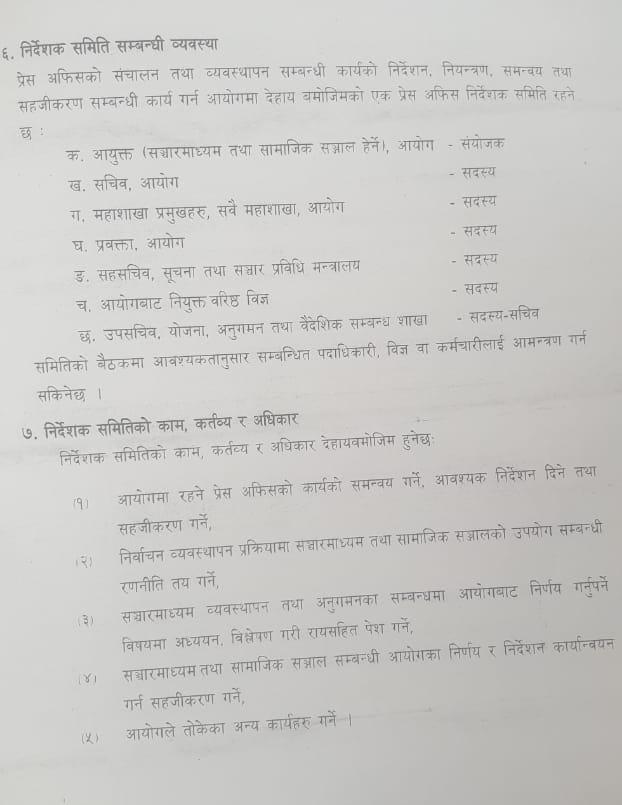 निर्देशक समितिले प्रेस अफिसको कार्यको समन्वय गर्ने, आवश्यक निर्देशन दिने तथा सहजीकरण गर्ने, निर्वाचन व्यवस्थापन प्रक्रियामा सञ्चारमाध्यम तथा सामाजिक सञ्जालको उपयोग सम्बन्धी रणनीति तय गर्ने, सञ्चारमाध्यम व्यवस्थापन तथा अनुगमनका सम्बन्धमा आयोगबाट निर्णय गर्नुपर्ने विषयमा अध्ययन, विश्लेषण गरी रायसहित पेस गर्ने तथा सञ्चारमाध्यम तथा सामाजिक सञ्जाल सम्बन्धी आयोगका निर्णय र निर्देशन कार्यान्वयन गर्न सहजीकरण गर्ने लगायतका कार्यहरू गर्ने व्यवस्था छ । (हेर्नुहोस्, अवधारणापत्र पेज ६)