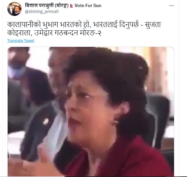 केही दिनयता नेपाली कांग्रेसकी नेतृ सुजाता काेइरालाकाे भनाइ भन्दै १६ सेकेन्डकाे एउटा भिडियाे क्लिप सामाजिक सञ्जालमा भाइरल भएकाे छ । साे भडियाेसँगै फेसबुक र ट्वीटरमा यस्ताे स्टाटस पाेस्ट गरिएकाे छ : “कालापानी भूभाग भारतकाे हाे, भारतलाई दिनुपर्छ- सुजाता काेइराला, नेतृ, नेपाली कांग्रेस, उम्मेद्वार गठबन्धन, माेरङ-२ ।”