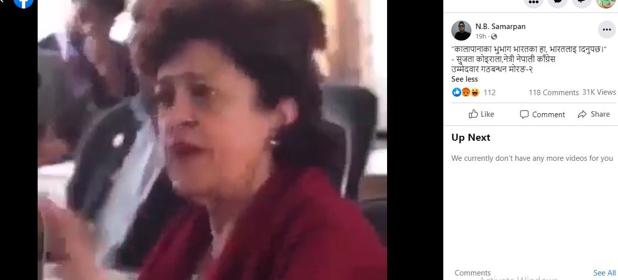 केही दिनयता नेपाली कांग्रेसकी नेतृ सुजाता काेइरालाकाे भनाइ भन्दै १६ सेकेन्डकाे एउटा भिडियाे क्लिप सामाजिक सञ्जालमा भाइरल भएकाे छ । साे भडियाेसँगै फेसबुक र ट्वीटरमा यस्ताे स्टाटस पाेस्ट गरिएकाे छ : “कालापानी भूभाग भारतकाे हाे, भारतलाई दिनुपर्छ- सुजाता काेइराला, नेतृ, नेपाली कांग्रेस, उम्मेद्वार गठबन्धन, माेरङ-२ ।”