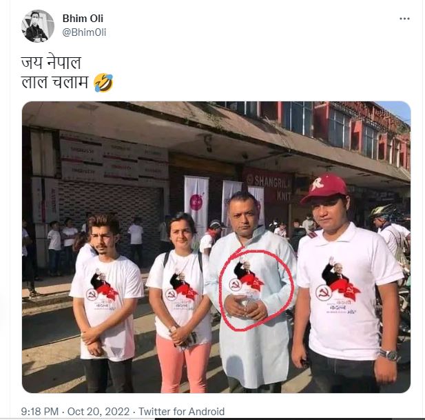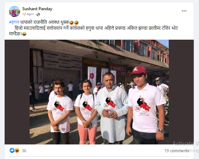 फोटोमा थापासहित काठमाडाैँ क्षेत्र नं ५ बाट स्वतन्त्र उम्मेदवार रञ्जु दर्शना र अन्य दुई युवा देखिन्छन् । उनीहरूले लगाएकाे सेतो टी-सर्ट र कुर्थामा माओवादी अध्यक्ष पुष्पकमल दाहाल ‘प्रचण्ड’ र सो दलकाे चुनाव चिह्न हँसिया हथाैडाकाे तस्बिर देख्न सकिन्छ। गत कात्तिक ३ गते @BhimOli नामक ट्विटर प्रयाेगकर्ताले “जय नेपाल लाल चलाम” भन्दै साे फाेटाे सेयर गरेका थिए । त्यस्तै कात्तिक ५ गते नारायण खत्री नामक फेसबुक प्रयाेगकर्ताले “यिनलाई पनि देउवाले हली बनाए” भन्दै उक्त तस्बिर सेयर गरेका थिए । स्थानीय निर्वाचनमा समेत यही फोटो फैलिएको हामीले फेला पारेका छाैँ [स्क्रिनसट]।