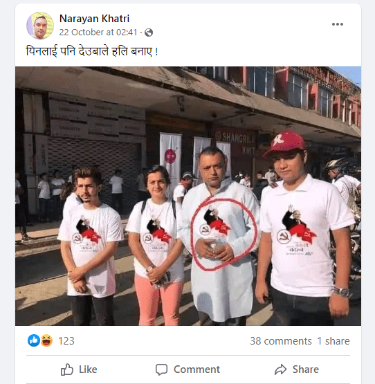 निर्वाचनका सन्दर्भमा फैलिएको फोटोमा नेपाली कांग्रेसका उम्मेदवार थापाले लगाएकाे कुर्थामा नेकपा माओवादीकाे प्रचार सामग्रीलाई कम्प्युटरमार्फत ताेडमाेड गरी सेयर गरिएकाे पाइएकाे छ । ५ वर्ष पुरानो फोटोलाई केही परिवर्तन गरी सामाजिक सञ्जालमा फैलाइएकले यसलाई नेपाल चेकले भ्रामक ठहर गरेकाे छ ।