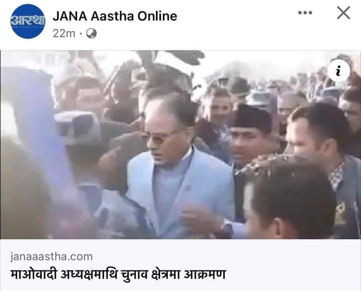 नेकपा (माओवादी केन्द्र) अध्यक्ष तथा गाेरखा क्षेत्र नम्बर २ का उम्मेदवार पुष्पकमल दाहाल प्रचण्डलाई गाेरखावासीले आक्रमण गरेकाे । | सामाजिक सञ्जाल प्रयोगकर्ता | भ्रामक |