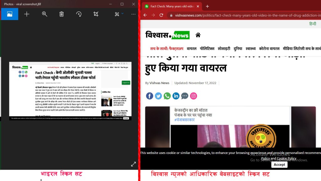 शीर्षककाे तलपट्टि “updated: November 17, 2022” लेखिएकाे देखिन्छ । त्यस्तै, स्क्रिनसटकाे दायाँतिर “Fact Check: जबलपुर मेखला रिजॉर्ट में युवती की हत्या करने का आरोपी भी उसी के समुदाय का है, भ्रामक दावा वायरल” र “Fact Check : शिवराजसिंह चौहान के पुराने वीडियो के साथ छेड़छाड़ करके किया जा रहा है वायरल” शीर्षकका दुईवटा तथ्य जाँच देखिन्छ । स्क्रिनसटकाे तल आधा काटिएकाे पाँचवटा अक्षर देखिन्छ । त्यसैगरी प्रकाशित सामग्रीलाई सिधै सेयर गर्नका लागि वेबपेजमा राखिने फेसबुक, ट्विटर, ह्वाट्स्यापकाे आइकन एउटा लाइनमा र ठीक त्यसैकाे तल लिङ्क्डइन, मेसेन्जर र इन्स्टाग्रामकाे आइकन अर्काे लाइनमा देखिन्छ । भाइरल सामग्रीमा केही भाषिक अशुद्धता छ । जस्ताे “राष्ट्रपति” लाई “राष्ट्रपनि”, “ओली” लाई कतै ओली लेखिएकाे छ भने कतै “औली” लेखिएकाे छ ।