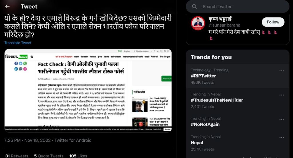 अहिले सामाजिक सञ्जाल ट्विटरमा भारतीय तथ्य जाँचकी संस्था विश्वास न्यूजकाे तथ्य जाँच भन्दै नेपालकाे आम निर्वाचनमा पूर्वप्रधानमन्त्री केपी शर्मा ओलीकाे पल्ला भारी भएकाे र केपी ओलीलाई राेक्न भारतबाट स्पेसल टास्क फाेर्स नेपाल आएकाे भन्ने एउटा सामग्री (स्क्रिनसट) भाइरल भएकाे छ । ट्विटर प्रयाेगकर्ता ‘@sunsaribaraha’ ले मंसिर १ गते भारतीय तथ्य जाँचकी विश्वास न्यूजकाे जस्ताे देखिने स्क्रिनसट सेयर गर्दै लेखेका छन्, “याे के हाे ? देश र एमालेविरुद्ध के गर्न खाेजिँदै छ ? यसकाे जिम्मेवारी कसले लिने ? केपी ओली र एमाले राेक्न भारतीय फाैज परिचालन गरिँदैछ हाे ?”