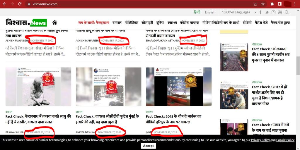 तथ्य जाँचका लागि हामीले सबैभन्दा पहिले विश्वास न्यूज हेर्यौं । भाइरल भएकाे स्क्रिनसट र विश्वास न्यूजकाे आधिकारिक वेबसाइट उस्तै देखिएपछि हामीले भाइरल भएकाे स्क्रिनसटकाे शीर्षक राखेर गुगलमा सर्च गर्यौं । तर त्यसमा भनिएजस्ताे सामग्री भेटिएन । त्यसपछि हामीले मंसिर १ गते विश्वास न्यूजले प्रकाशित गरेका तथ्य जाँच हेर्यौं । त्यस दिन विश्वास न्युजले जम्मा छवटा तथ्य जाँच प्रकाशित गरेकाे रहेछ । तर ती छवटै तथ्य जाँचमा भाइरल भएकाे स्क्रिनसटमा जस्ताे ‘निर्वाचन प्रभावित गर्न भारतीय स्पेसल टास्क फाेर्स नेपाल आएकाे’ भन्ने छैन ।