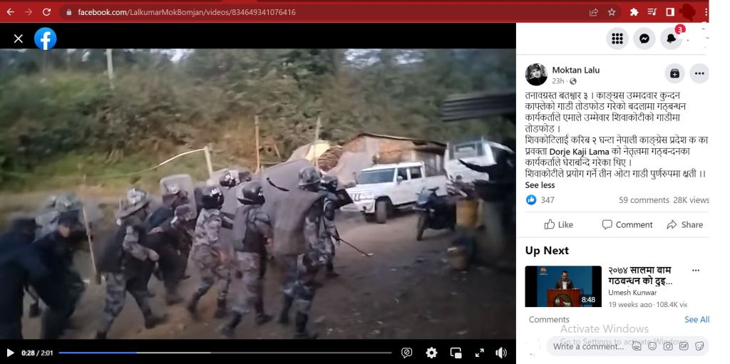 त्यसैगरी साेही भिडियाे नेपाल प्रेसले ट्विटरमा सेयर गर्दै लेखेकाे छ, “पुनः मतदानमा पनि दोलखा वैत्यश्वर-३ मा तनाव,एमाले उम्मेदवार बालकृष्ण शिवाकोटीमाथि दुर्व्यवहार ।”