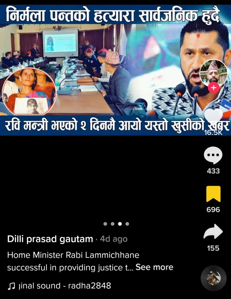 खोज्दै जाँदा अर्को टिकटक भेटियो । @dilliprasadgautam0 नामक प्रयोगकर्ताले पाेस्ट गरेको भिडियोमा गृहमन्त्री लामिछाने कञ्चनपुरकी किशाेरी निर्मला पन्तको हत्यारा नजिक पुगेको, लामिछाने कञ्चनपुर गएको दाबी गरिएको छ । उक्त भिडियो अहिलेसम्म ५ लाख पटक हेरिएकाे छ भने १६ हजार ५ सय जनाले लाइक गरेका छन् ।