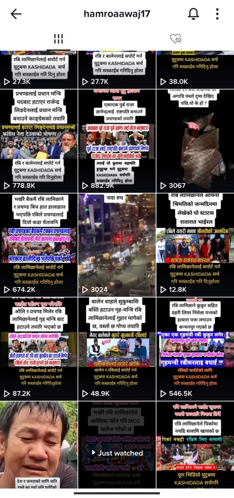 सामाजिक सञ्जालले इन्गेजमेन्ट अर्थात् लाइक, फलो, कमेन्ट र सेयरलाई प्राथमिकता दिन्छ । यस हाेडबाजीमा अघि पर्नका लागि प्रयाेगकर्ताहरूले अनेक उपाय लगाउँछन् । कसरी आफू फरक र माैलिक देखिने र भाइरल हुने भन्ने ध्याउन्नले गर्दा अहिले सामाजिक सञ्जाल मिथ्या सूचना फैलाउने साधन बनेको छ । कैयौं मिथ्या सूचना मानिसलाई दिग्भ्रमित पारी कसैकाे फाइदाका लागि फैलाइएका हुन्छन् भने केहीकाे उद्देश्य लाइक पाउने र फलोअर बढाउने हुन्छ। सामाजिक सञ्जालमा भेटिने कैयौं पोस्ट मिथ्या सूचना भनी खुट्याउन सकिने खालका हुन्छन् । तर पनि ती बारम्बार तपाईंकाे फिड वा टाइमलाइनमा आइपुग्छन् । किन त ? उपप्रधान तथा गृहमन्त्री रवि लामिछाने जाेडिएका केही भिडियाे सामग्रीकाे विश्लेषण गराैं ।