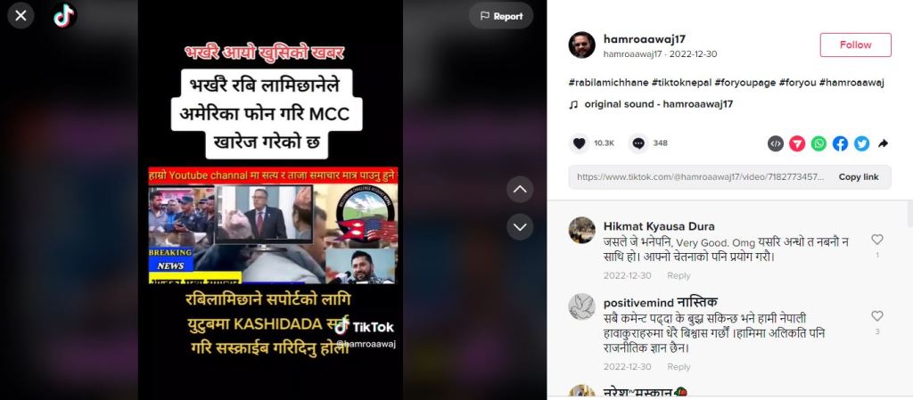 @hamroaawaj17 नामक एक टिकटक प्रयोगकर्ताले गत पुस १६ गते सेयर गरेको भिडियोमा लेखिएको छ, “भरखरै रवि लामिछानेले अमेरिका फोन गरी MCC खारेज” । १० सेकेन्डकाे उक्त क्लिप ३ लाखभन्दा बढी पटक हेरिएकाे छ । उक्त भिडियोमा अंग्रेजी भाषाको अडियो क्लिप छ भने युट्युब च्यानलमा सत्यतथ्य समाचार भन्ने दाबीका साथ “रवि लामिछानेको सपोर्टका” लागि एक युट्युब च्यानल सब्स्क्राइब गर्न भनिएको छ। सो टिकटकमा उपप्रधान तथा गृहमन्त्री रवि लामिछाने र काठमाडाैं महानगरका मेयर बालेन शाहका नाममा राखिएका भिडियोहरू लाखौं पटक हेरिएका छन् । हरेक भिडियोमा ‘KASHIDADA’ नामक युट्युब च्यानल सब्स्क्राइब गर्न भनिएको छ।
