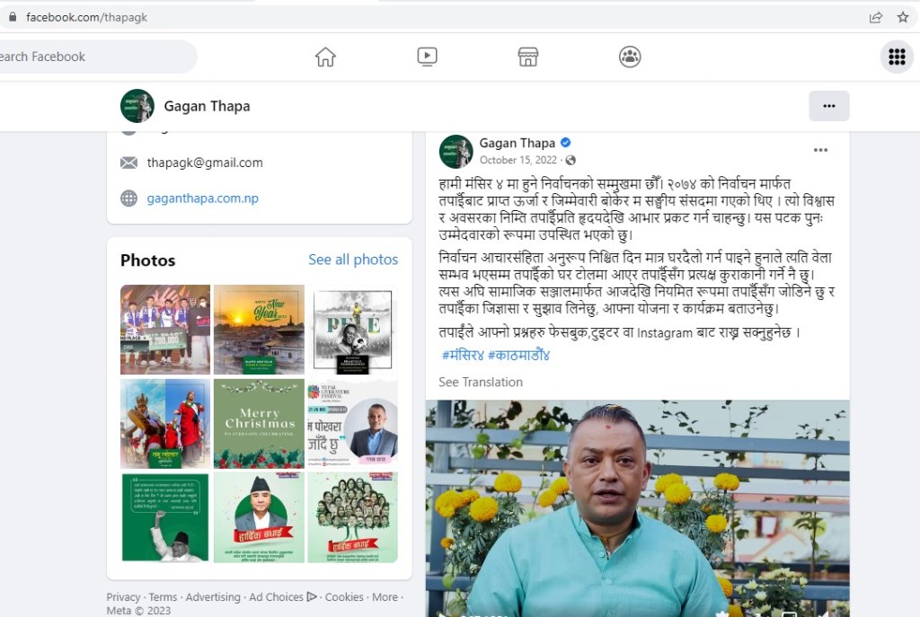 सामाजिक सञ्जाल ट्वीटरमा गगन थापाका १२ लाख फलोअर्स छन् भने फेसबुकमा उनका ५० हजारभन्दा बढी फलोअर्स छन् । चुनावी प्रचारप्रसारका लागि थापा भदाै १५ गतेदेखि सामाजिक सञ्जालमा सक्रिय देखिन्छन् । सामाजिक सञ्जाल प्रयोग गर्दा थापाले छोटो क्याप्सन र ह्यासट्यागको बढी प्रयोग गरेका थिए । उनले “मंसिर ४, काठमाडौं ४, गगन थापा, इलेक्सन, नेपाल” जस्ता ह्यासट्यागको बढी प्रयोग गरेका थिए ।