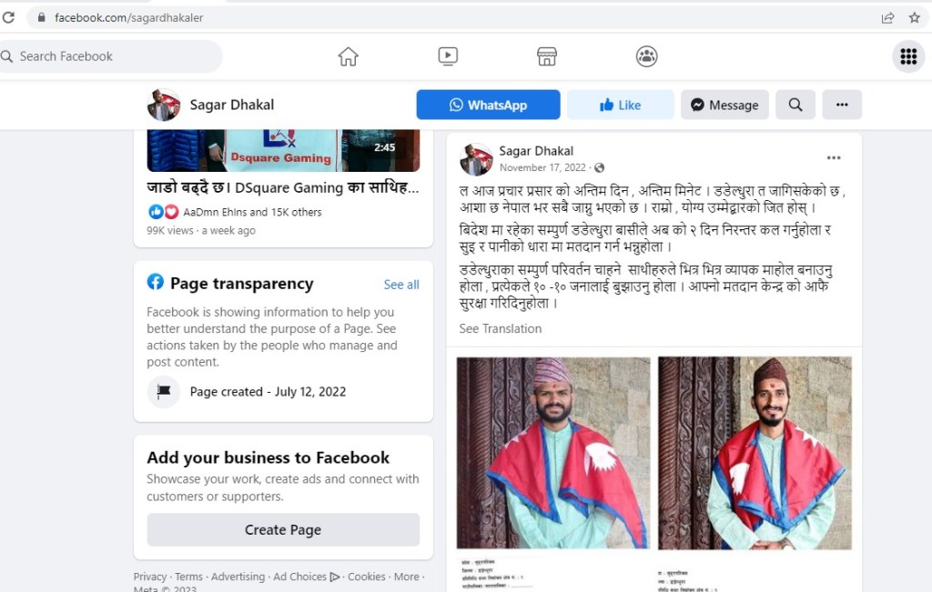 पूर्वप्रधानमन्त्री शेरबहादुर देउवाविरुद्ध डडेलधुरामा स्वतन्त्र उम्मेदवारी दिएर चर्चामा आएका युवा सागर ढकालले पनि भोट माग्न फरक तरिका अपनाए । डोटेली भाषाको लवजमा भोट मागेर उनी चर्चामा आए । डडेल्धुराका विभिन्न गाउँमा पुगेका ढकालले चुनाव प्रचारप्रसारका हरेकजसो गतिविधि उनले सामाजिक सञ्जालमा पोस्ट गरेका थिए । ढकालका फेसबुक पोस्ट हेर्दा भोट माग्न उनले भिडियो प्रयाेग गरेका थिए । कात्तिक २७ गते फेसबुकमा उनले यस्ताे पोस्ट गरेका थिए, “कुनै चलखेल नभए जित सुनिश्चित नै छ । इन्डिया, खाडीमा हुनुभएका सम्पूर्ण डडेल्धुरावासीले घरमा दिनदिनै फोन गरेर सागर ढकाललाई सुईमा मतदान गर्न भन्नुहोला । आज नवदुर्गा वडा २ नम्बरमा बूढी आमाले ‘नातिले फोन गरेर सुई र धारामा भोट हाल्न भन्या छ । निकै खुसी लाग्यो । आउनुहोस् है छिटोछिटो सबै जना डडेल्धुरा ।”