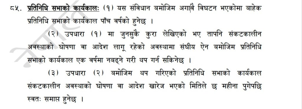नेपालको संविधान २०७२ को धारा ८५ मा प्रतिनिधिसभाको कार्यकाल’bout उल्लेख गरिएको छ । उक्त धाराको उपधारा (१) मा भनिएको छः “यस संविधान बमोजिम अगावै विघटन भएकोमा बाहेक प्रतिनिधिसभाको कार्यकाल पाँच वर्षको हुनेछ ।”