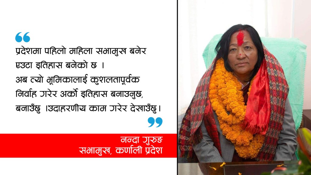 संघीयता कार्यान्वयन भएपछि नेपालमा दुई पटक प्रदेश सभाकाे निर्वाचन भइसकेकाे छ । पहिलाे प्रदेशसभाकाे तुलनामा यसपालिकाे प्रदेशसभामा महिला प्रतिनिधित्व प्रतिशतका आधारमा बढेकाे देखिएपनि यसपटक प्रत्यक्ष निर्वाचित महिलाकाे संख्या भने घटेकाे छ । यसअघिकाे प्रदेशसभामा सातैवटा प्रदेशमा पुरुष सभामुख बनेका थिए भने यसपालि प्रदेशसभाकाे इतिहासमा पहिलाेपटक कर्णाली प्रदेशमा महिला सभामुख बनेकी छन् । नेकपा एमालेबाट समानुपातिक प्रतिनिधित्व गर्दै कर्णालीबाट चुनिएकी नन्दा गुरुङ नेपालकाे प्रदेशसभाकाे इतिहासमा पहिलाे महिला सभामुख बनेकी हुन् । सभामुख गुरुङसँग नेपाल चेकले गरेकाे प्रश्नाेत्तरकाे सम्पादित अंश ।