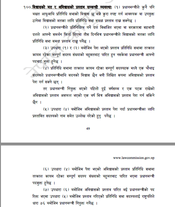 संविधानको धारा १०० मा सरकारमा सहभागी दलले समर्थन फिर्ता लिएमा विश्वासको मत लिनुपर्ने व्यवस्था गरिएको छ । उक्त धाराको उपधारा २ मा भनिएको छ, “प्रधानमन्त्रीले प्रतिनिधित्व गर्ने दल विभाजित भएमा वा सरकारमा सहभागी दलले आफ्नो समर्थन फिर्ता लिएमा ३० दिनभित्र प्रधानमन्त्रीले विश्वासको मतका लागि प्रतिनिधिसभा समक्ष प्रस्ताव राख्नुपर्नेछ।”