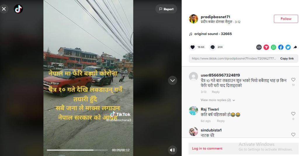 कोरोना भाइरसकाे संक्रमण फेरि बढ्न थालेकाे भन्दै अहिले टिकटकमा एउटा भिडियो भाइरल भएकाे छ। @pradipbasnet71 नामक टिकटक प्रयाेगकर्ताले गत फागुन २९ गते भिडियाे क्लिप पाेस्ट गर्दै लेखेका थिए, “नेपालमा फेरि बढ्यो कोरोना। चैत्र १० गतेदेखि लकडाउन गर्ने तयारी हुँदै। सबैजनाले माक्स लगाउन नेपाल सरकारको आग्रह।” उक्त भिडियाेमा गाडी गुडिरहेको बाटोको भिडियो रहेको छ। चैत्र ७ गते सम्ममा साे भिडियाे ७ लाख २३ हजार बढी पटक हेरिएकाे छ भने १८ हजार भन्दा बढी लाइक र ७ सय भन्दा बढी पटक सेयर गरिएकाे छ।