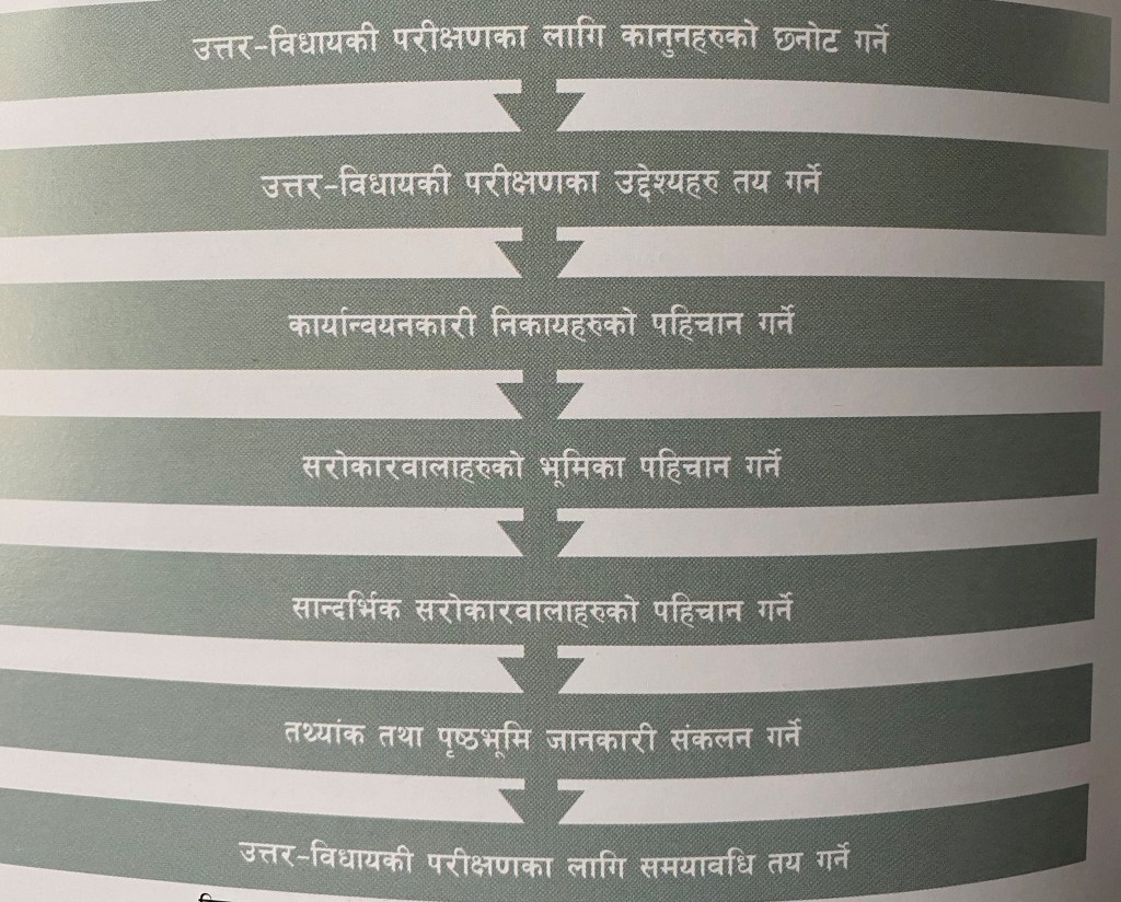 उत्तर विधायकी परीक्षण गर्दा मुख्यतया दुई विषयलाई ध्यान दिनुपर्छ: १. कुनै कानुन संसदमा प्रवेश गर्दाकाे सन्दर्भ र पृष्ठभूमि केलाउने २. कानुन बनेपछि त्यसले लक्ष्यित परिणाम ल्यायाे या ल्याएन भनी मूल्यांकन गर्ने।