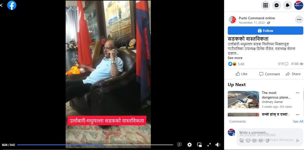 यस भिडियाेकाे सत्यापनका लागि हामीले गुगलमा “उर्लाबारी-मधुमल्ला सडक” राखेर खाेजी गर्याैँ। तर हामीले उक्त भिडियाेकाे मुल संस्करण फेला पार्न सकेनाैँ। तिनै शब्दहरु राखी फेसबुकमा खाेज्दा पूर्वी कमाण्ड अनलाइनकाे फेसबुक पेजमा उक्त भिडियाे फेला पर्याे । साे भिडियाे कात्तिक २५, २०७९ मा साे पेजमा पाेस्ट गरिएकाे फेला पर्याे । गत मङ्सिर ४, २०७९ मा आम निर्वाचन हुनुअघि प्रचार प्रसारका क्रममा प्रचण्डले कसैलाई उक्त सडकसम्बन्धी निर्देशन दिएकाे बुझिन्छ।