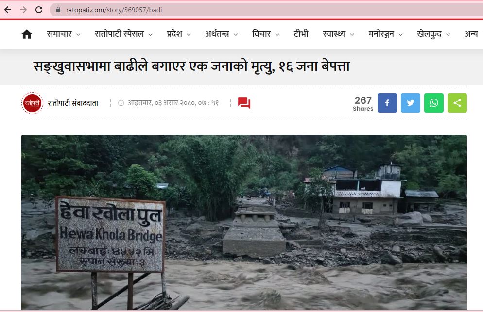 राताेपाटीमा असार ३ गते बाढी पहिराे सम्बन्धी समाचार प्रकाशित भयाे । विराटनगरबाट प्रेषित ‘संखुवासभामा बाढीले बगाएर एक जनाकाे मृत्यु, १६ जना बेपत्ता’ शीर्षक समाचारमा बाढीले बगाएकाे हेवा खाेलाकाे पुलकाे तस्बिर छ । समाचारमा संखुवासभाकाे हेवा खाेलामा आएकाे बाढीले बगाएर एक जनाकाे मृत्यु भएकाे जनाइएकाे छ । त्यसैगरी नेपाल लाइभमा पनि साेही तस्बिर संखुवासभाकाे हेवाखाेलामा आएकाे बाढीले बगाएकाे पुलकाे भन्दै प्रकाशित छ ।