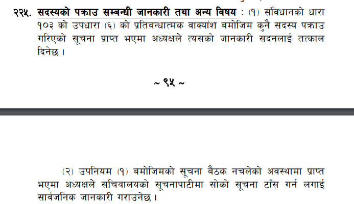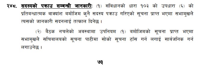 * यस अघि प्रतिनिधिसभा नियमावली २०७५ को नियम २४४ भएकाेमा त्यसलाई सच्याएर प्रतिनिधिसभा नियमावली २०७९ को नियम २४८ बनाएका छाैँ । सँगैकाे नियमावलीकाे स्क्रिनसट पनि परिवर्तन गरिएकाे छ।