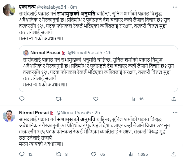 “सांसदलाई पक्राउ गर्न सभामुखको अनुमति चाहिन्छ, सुनिल शर्माको पक्राउ विशुद्ध अवैधानिक र गैरकानुनी छ” भन्दै निर्मल प्रसाईं नामक एक्स प्रयोगकर्ताले गरेकाे पाेस्ट १८०० भन्दा बढी प्रयोगकर्ताहरुमाझ पुगेकाे छ, यो पोष्टमा ९० भन्दा बढी प्रयाेगकर्ताले लाइक गरेका छन् भने ९ जनाले पुनः सेयर गरेका छन्। नेपाली कांग्रेसका केन्द्रीय सदस्य अजयबाबु सिवाकोटीले एक्समा लेखेका छन्, “संसद चलिरहेको बेला बहालवाला सांसदलाई पक्राउ गर्न के सभामुखले स्विकृति दिएका हुन् ?” १५० भन्दा बढी प्रयोगकर्ताले लाइक गरेको उक्त पोस्ट ४३ जनाले पुनः सेयर गरेका छन् भने १३ हजार ८ सय भन्दा बढी एक्स प्रयोगकर्ता माझ यो पोस्ट पुगेको देखिन्छ।