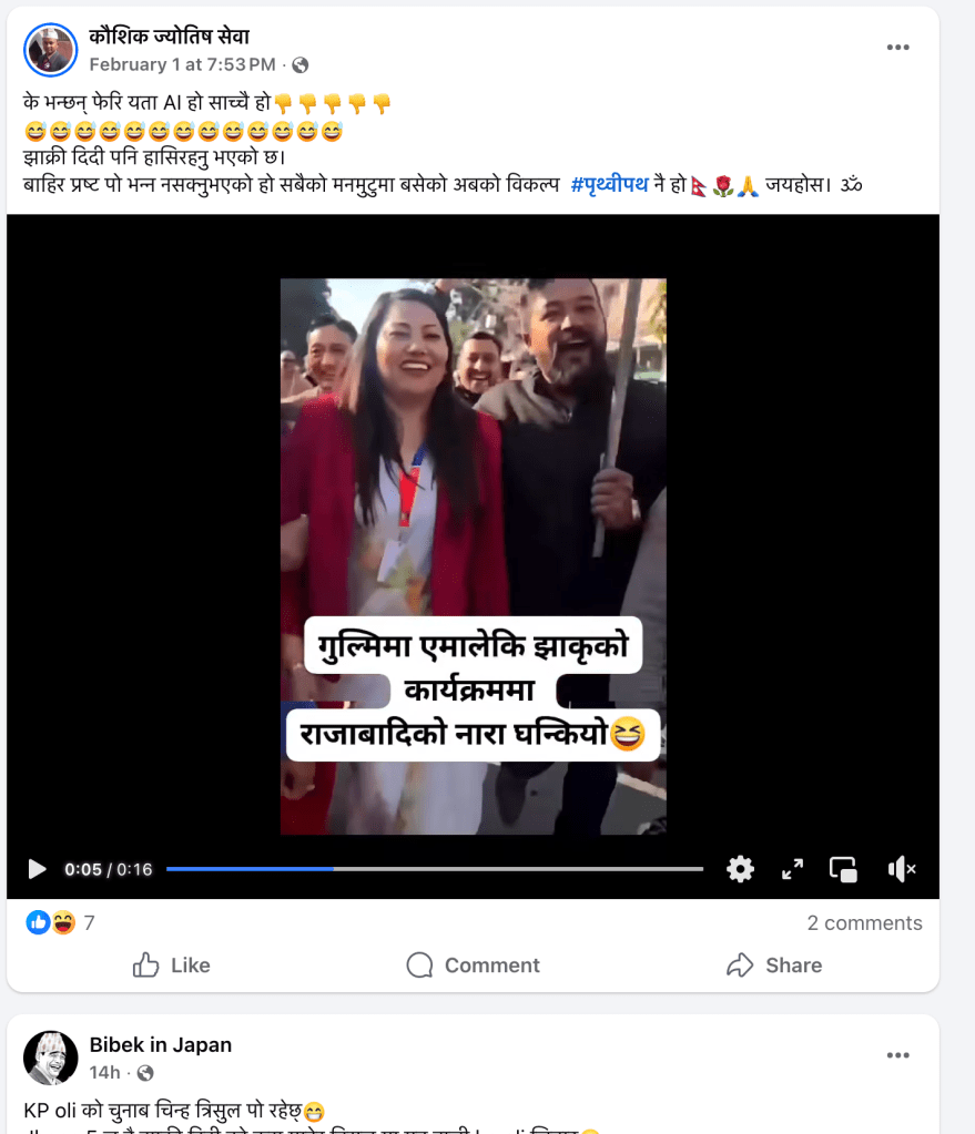 केही दिनयता नेकपा एमालेकी नेतृ रामकुमारी झाँक्री सहभागी जुलुसमा राष्ट्रिय स्वतन्त्र पार्टी (रास्वपा) काे पक्षमा नारा लागेकाे भन्दै २० सेकेन्डकाे एउटा भिडियाे क्लिप सामाजिक सञ्जालमा भाइरल भएकाे छ । साे भिडियाेसँगै फेसबुक र एक्समा “झाँक्री दिदीकाे बेहाल बनाएछन् । दुनियाँलाई देखाउन पनि हास्नै पर्याे” , “देख्न सुन्न बाँकी यही थियाे । गुल्मीमा एमालेकी झाँक्रीकाे कार्यक्रममा घन्टीकाे नारा” जस्ता स्टाटस र क्याप्सन लेखिएकाे छ ।