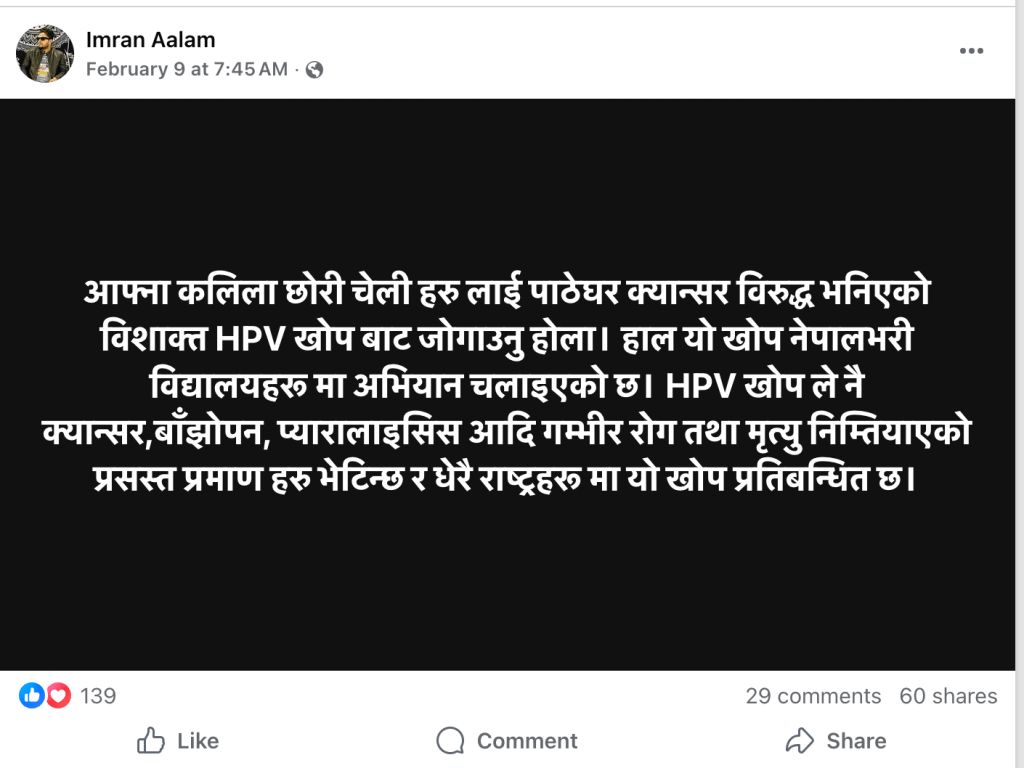 यसैगरी इमरान अलाम नामक फेसबुक प्रयाेगकर्ताले स्टाटस पोस्ट गर्दै अभिभावकहरुलाई आफ्ना छोरीहरूलाई एचपीभी खोपबाट जोगाउन आग्रह गरेका छन् । उनले खोपलाई “विषाक्त” बताउँदै खोपले क्यान्सर, बाँझोपन, प्यारालाइसिस लगायत गम्भीर रोग तथा मृत्यु समेत हुने दाबी गरेका छन्। उनले विभिन्न देशमा साे खोप प्रतिबन्धित रहेको दाबी पनि गरेका छन्।